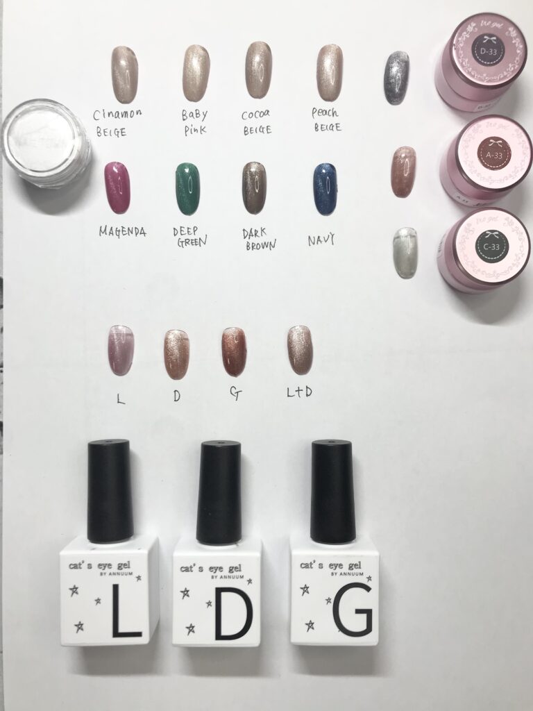 、ネイルタウンのエフェクトパウダーシャンパンと、ANUMEのマグネットジェルを使いました