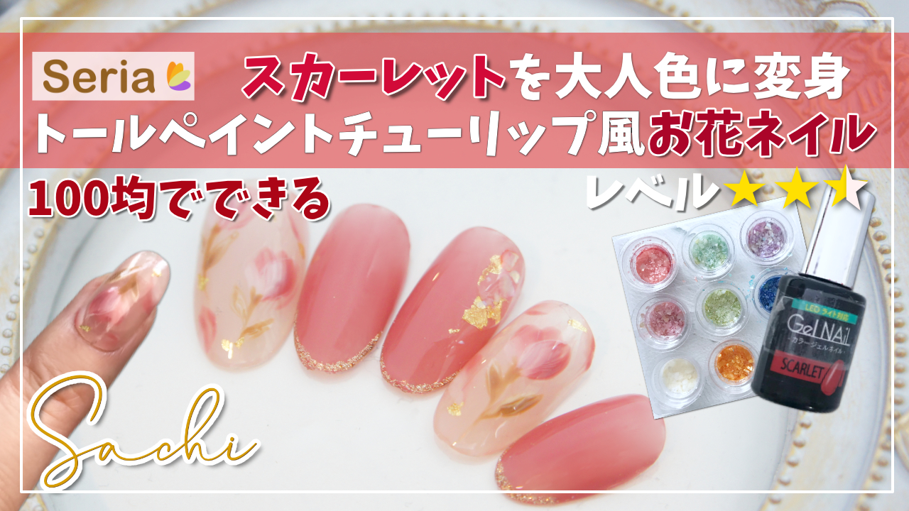 今回は、セリアジェルスカーレットを大人カラーに変身してかわいいお花ネイルで仕上げました。