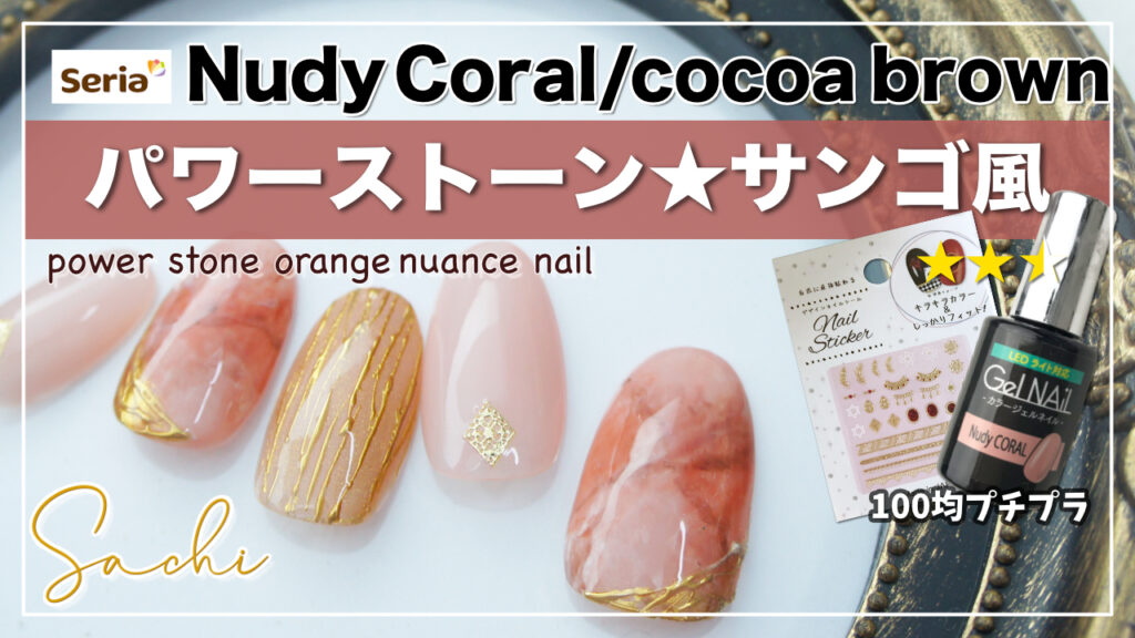 セリアジェル新色ヌーディーコーラルとココアブラウンでサンゴのような天然石ネイル(パワーストーン)